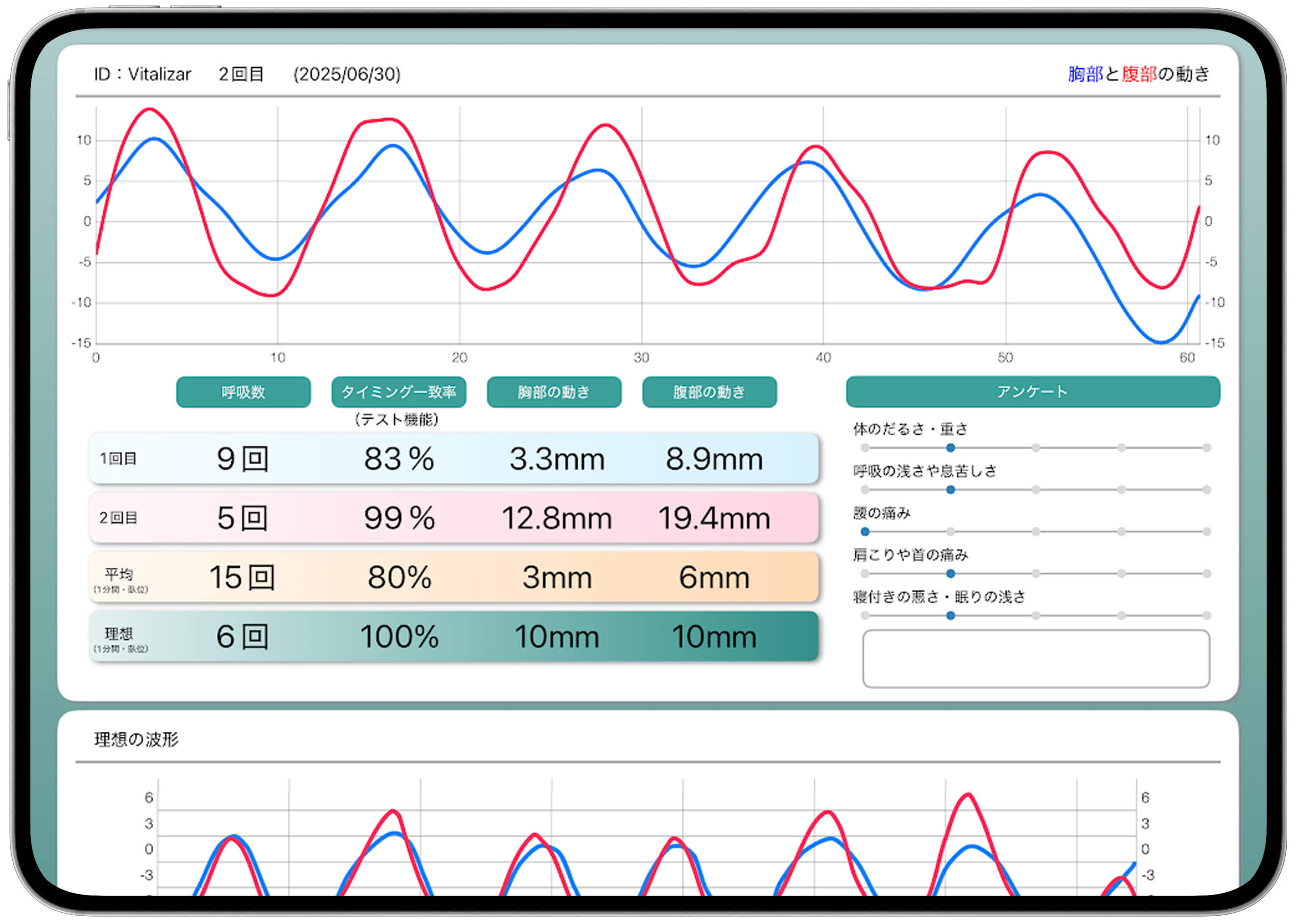 計測されたデータは波形として出力され、呼吸のリズムや胸腹部の動きの特徴を数値とともに可視化できる仕組みです。